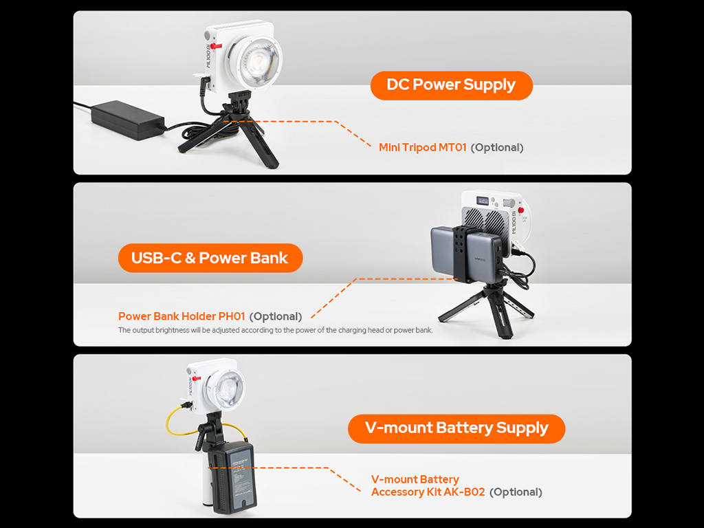 Çeşitli Güç Kaynağı ÇözümleriML100Bi, DC güç kaynağını, 14,8 V voltajlı V-Mount pili ve bir powerbank ile USB-C kablosunu kullanarak powerbank güç kaynağını destekleyerek çekim sürelerini uzatır ve acil durumlar için yedek güç sağlar.