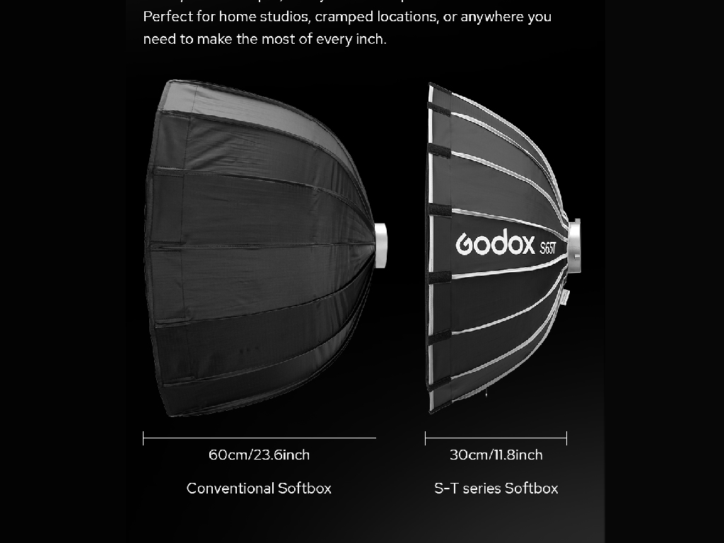 Kompakt Boyut Ve Hafif TasarımBenzersiz bir tasarım ile üretilen S65T, S85T ve S120T sadece 30 cm derinliğiyle standart softbox'ların neredeyse yarısı kadar bir boyuta sahiptir. Ev içi stüdyolar ve dar alanlarda ondan en iyi şekilde verim almanızı sağlar.