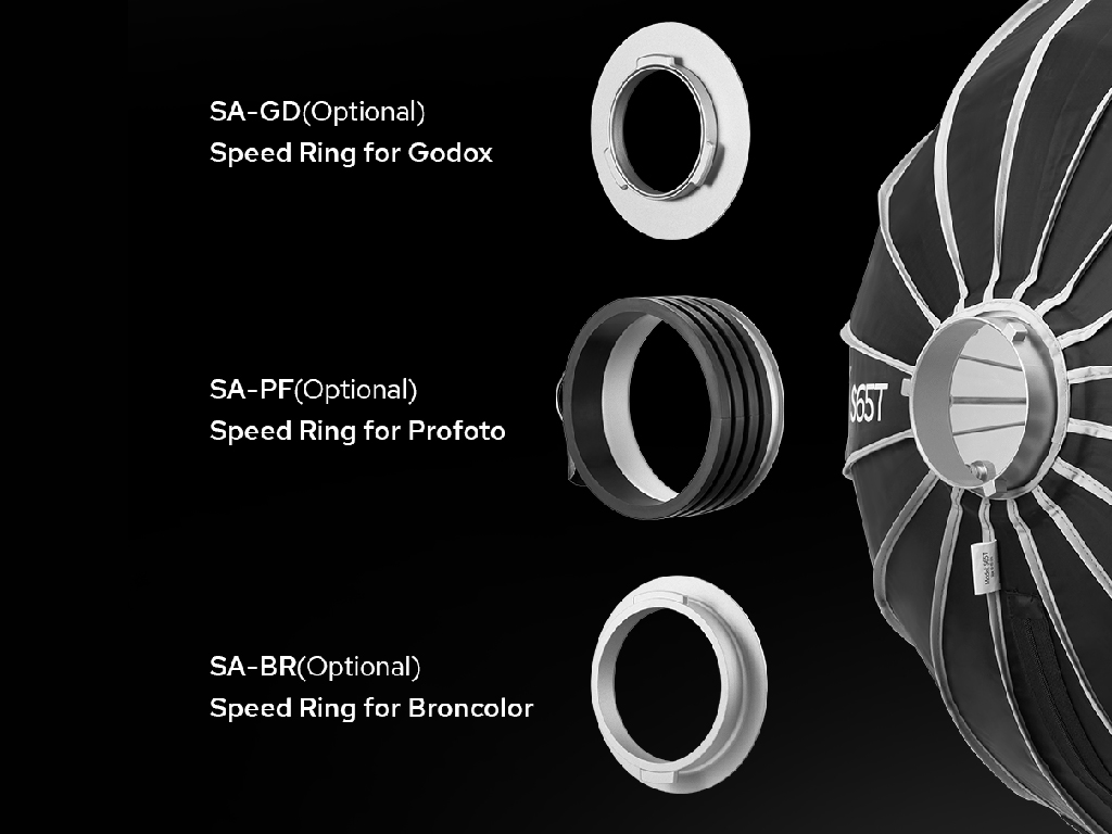 Çok Yönlü UyumlulukÇok çeşitli Bowens mountlu paraflaş ve sürekli ışıklarla uyumlu olan bu kolay kurulum şemsiye softbox, SA-GD, SA-PF ve SA-BR adaptörleri ile Godox mount, Profoto mount veya Broncolor mounta dönüştürülerek kullanılabilir.