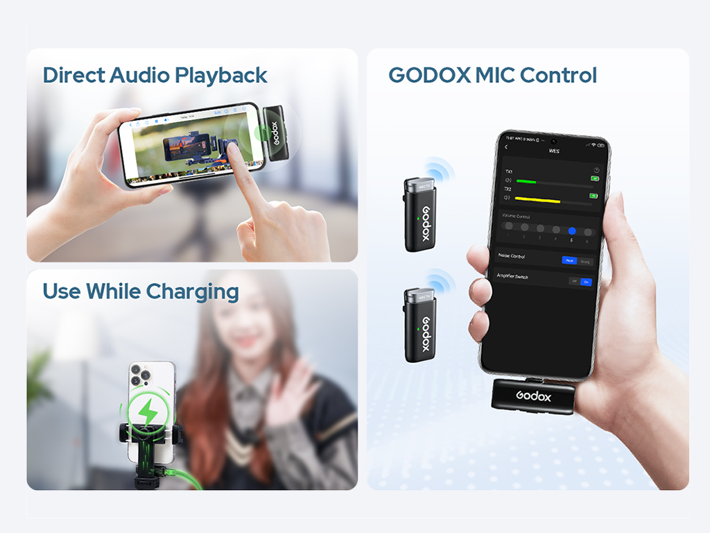 Kusursuz Kontrol ve ŞarjAkıllı telefonunuzdaki GODOX MIC uygulama içi kontrolüyle sesinizi zahmetsizce yönetin. RX'in tak ve çalıştır işleviyle, anında açma, telefon şarjı ve kesintisiz kullanım için doğrudan ses oynatmanın keyfini çıkarın.