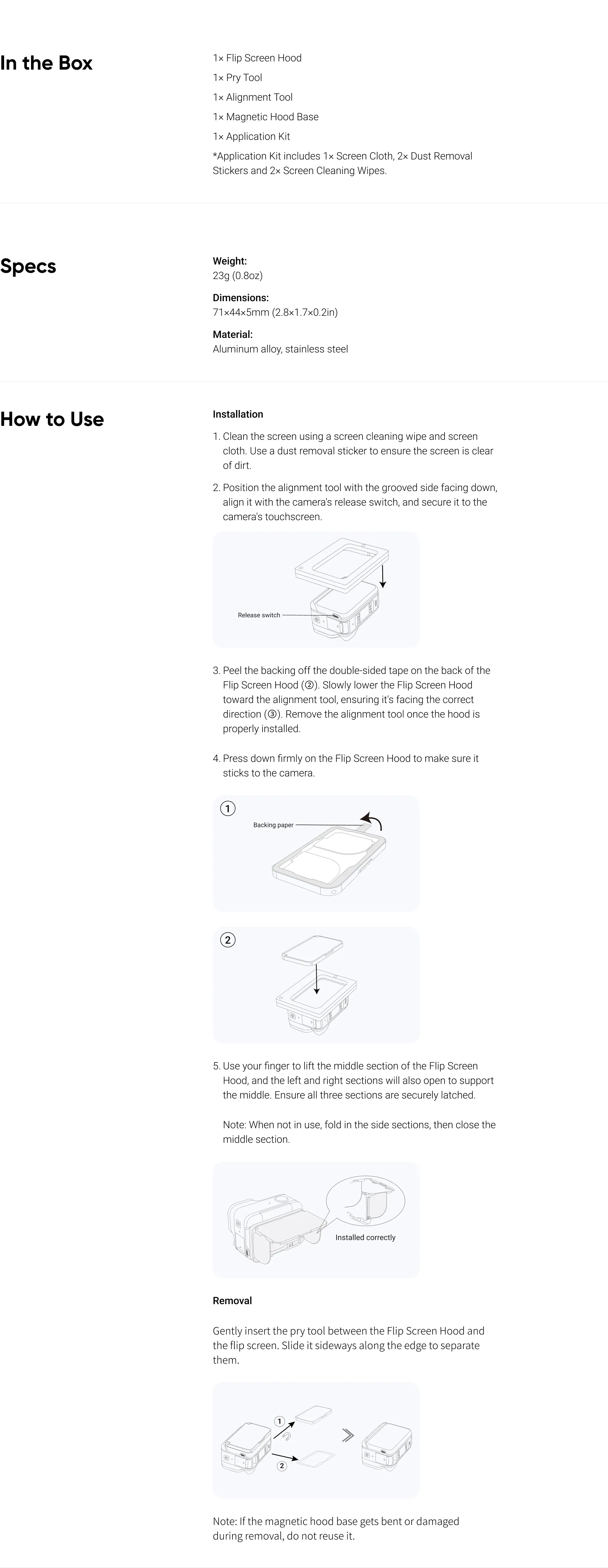 - Flip Screen Hood mıknatıs içerir. Paraziti önlemek için kalp pillerinden ve diğer cihazlardan uzak tutun.