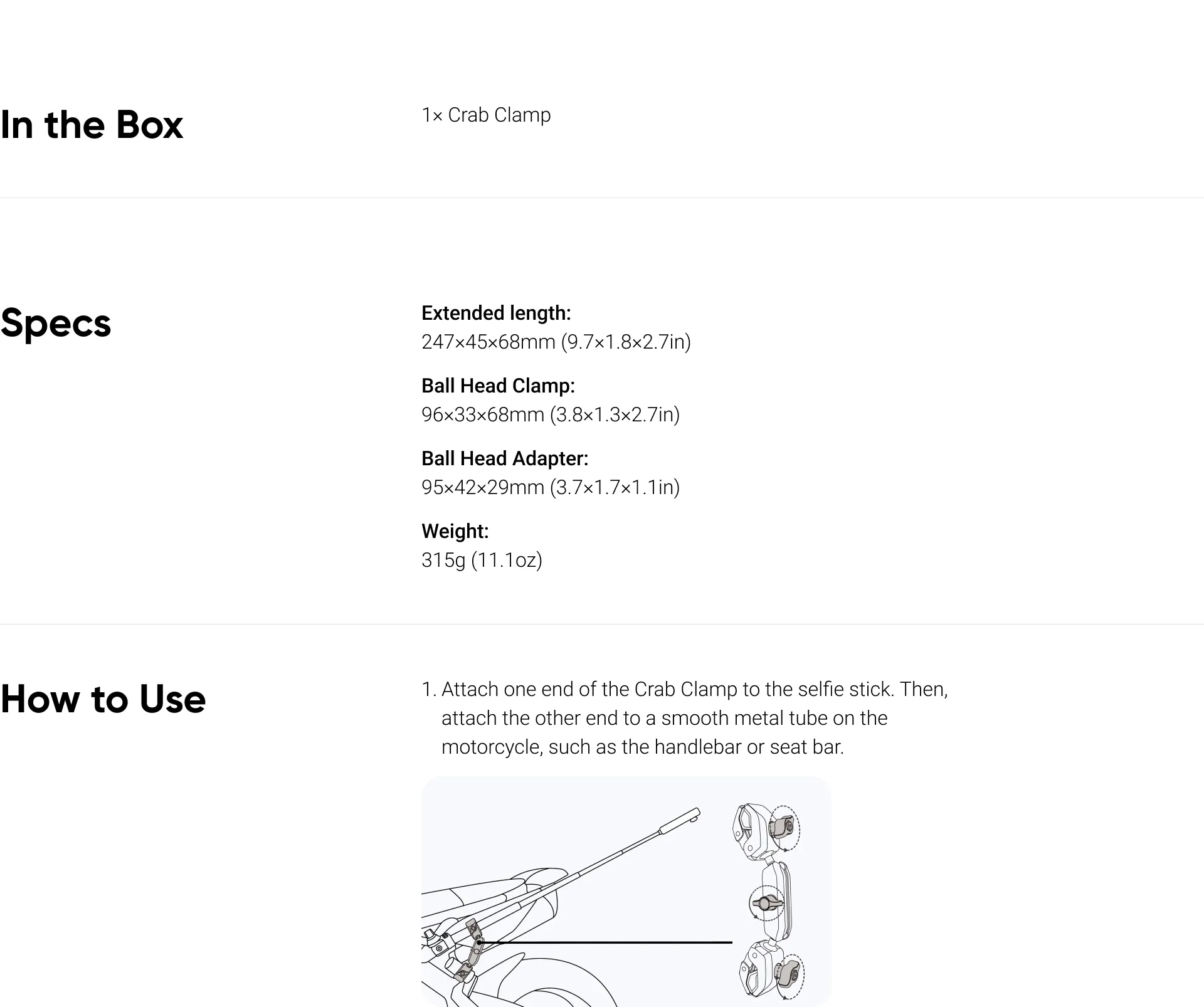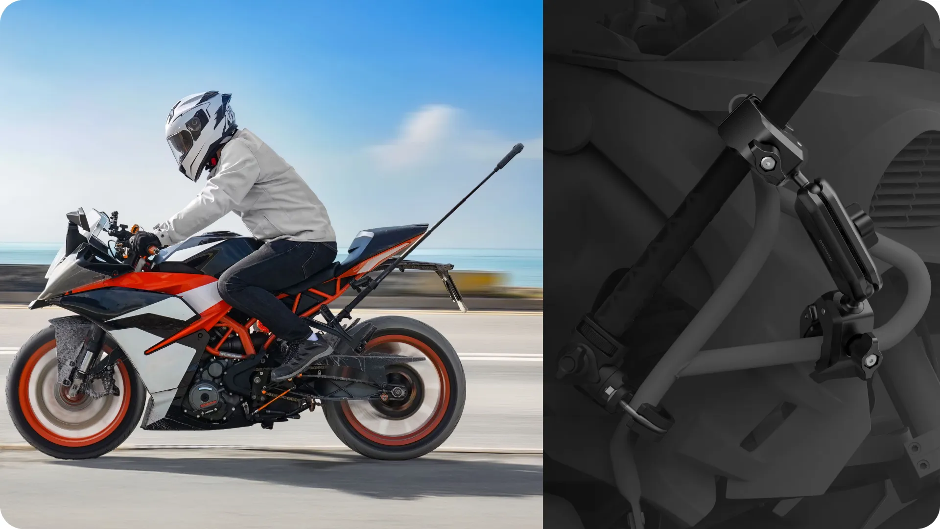 Daha da fazla denge için Action Invisible Selfie Stick & Heavy Duty Kelepçe veya Motosiklet U-Cıvata Bağlantı Aparatı ile birlikte kullanın.
