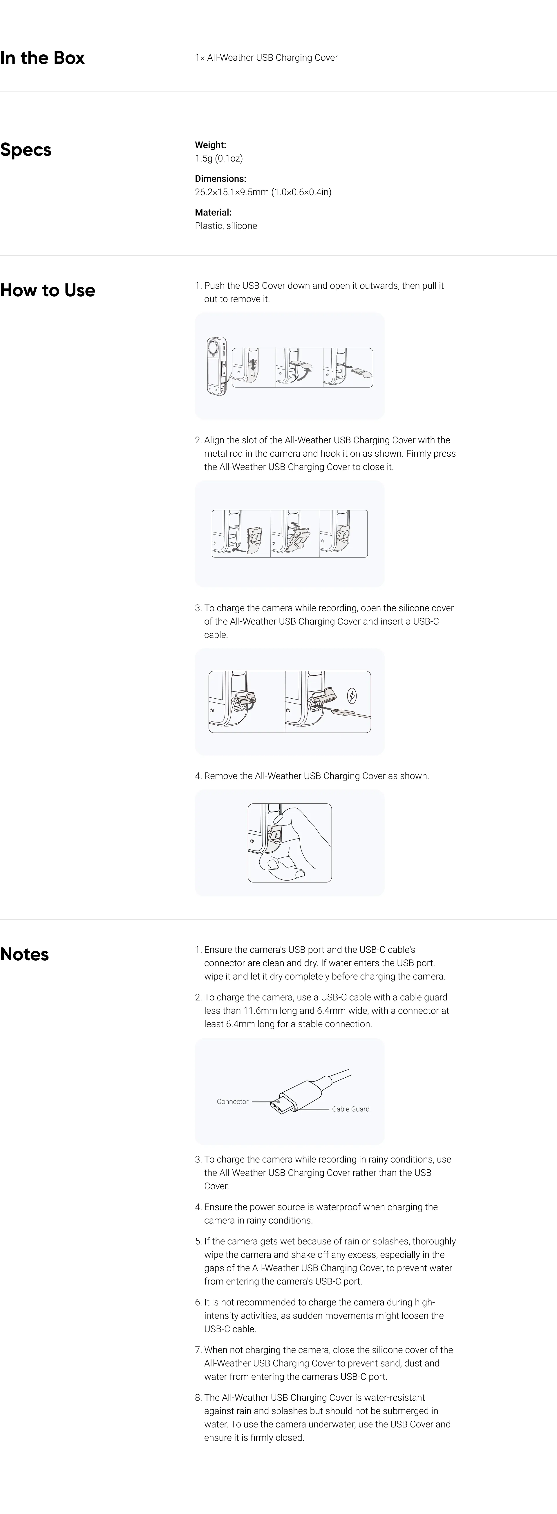 Yağmur yağsın ya da güneş açsın, güvenle çekim yapmaya devam edin. Insta360 X5 All-Weather USB Charging Cover